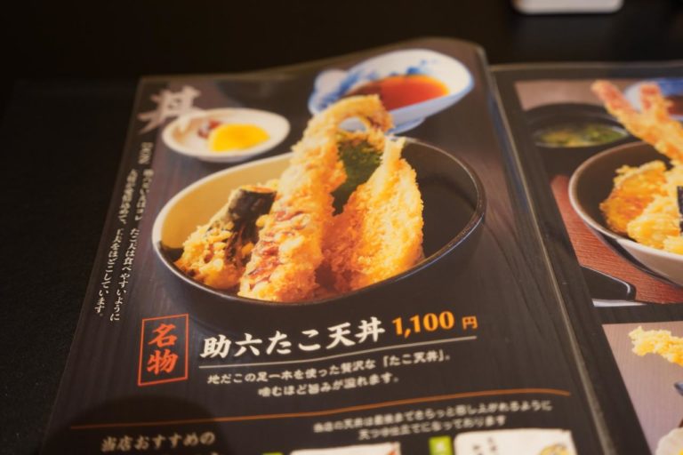 天ぷらやお刺身定食などもあって迷ったけど、やっぱり最初の目的だった「助六たこ天丼」をオーダー。お値段は1,100円です。どんなのが出てくるか楽しみ。