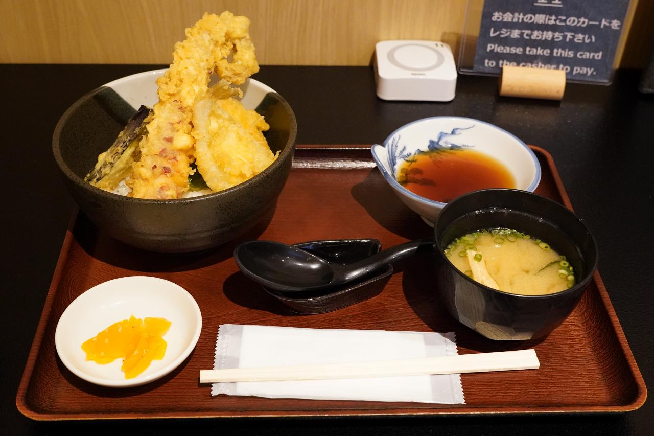 しばらく待って出てきたのがこちら。天丼とお味噌汁、それに漬物のセットです。天丼にしては珍しくタレが掛かっていないので、天つゆを付けていただく感じみたい。天ぷら定食ご飯乗せって雰囲気?