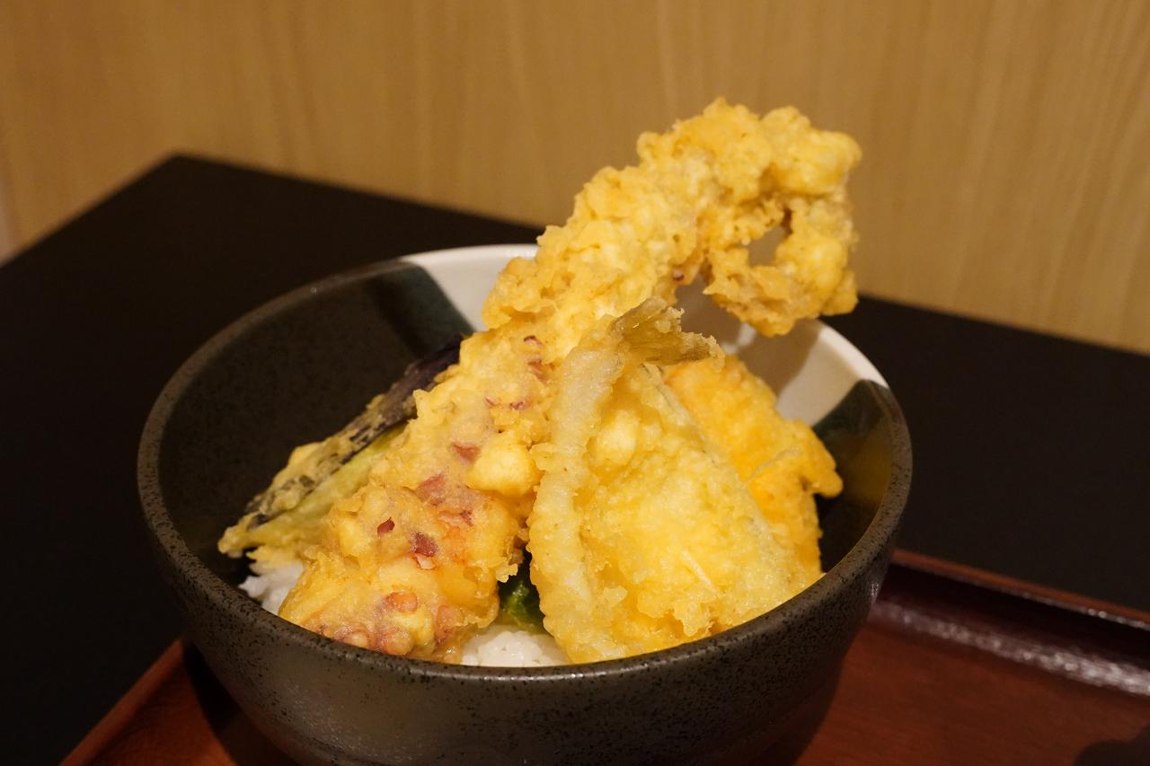 天ぷらは揚げたてで、たこの他にキスとたまねぎ、茄子、かぼちゃといった野菜天ぷらも乗っていてボリューム満点。そしてたこは中で切られているので食べやすく、肉厚で弾力があって美味しかった。でもこれ、一体どうやって作ってるのか、ちょっと気になりますね。
