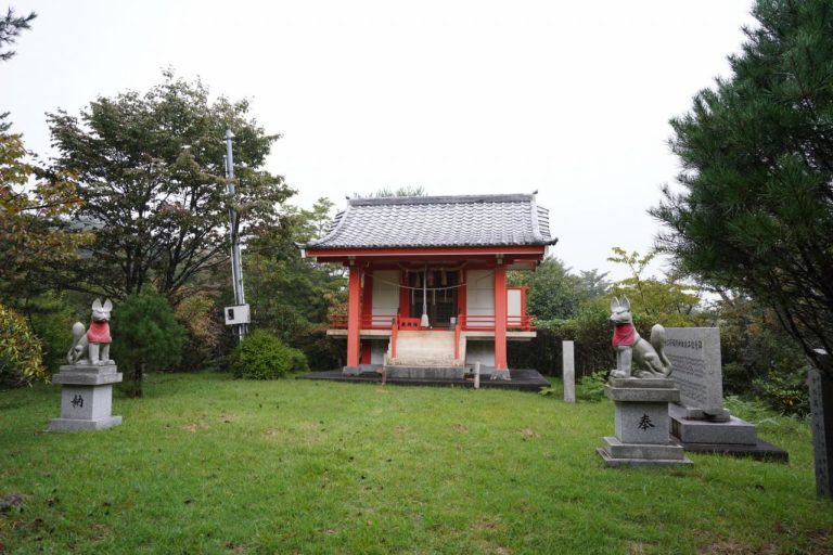 高台の頂上にはきれいに整備された本殿が佇んでいました。入口には2匹のキツネさんも座っています。お賽銭を入れてお参りをしてきたんだけど、お参りをしている瞬間に遠くから動物のような鳴き声が。歓迎してくれている……? のかな。