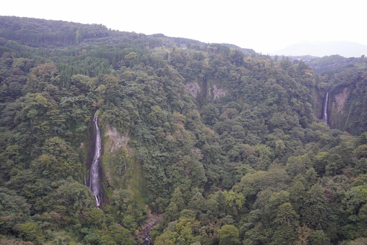 曇っているからもやってしまっているけど、右に見えるのが「震動の滝(男滝)」で左に見えるのが「女滝」です。本当は真ん中あたりに「小滝」「孫滝」があるみたいだけど、水量が少ないから見えないらしい。