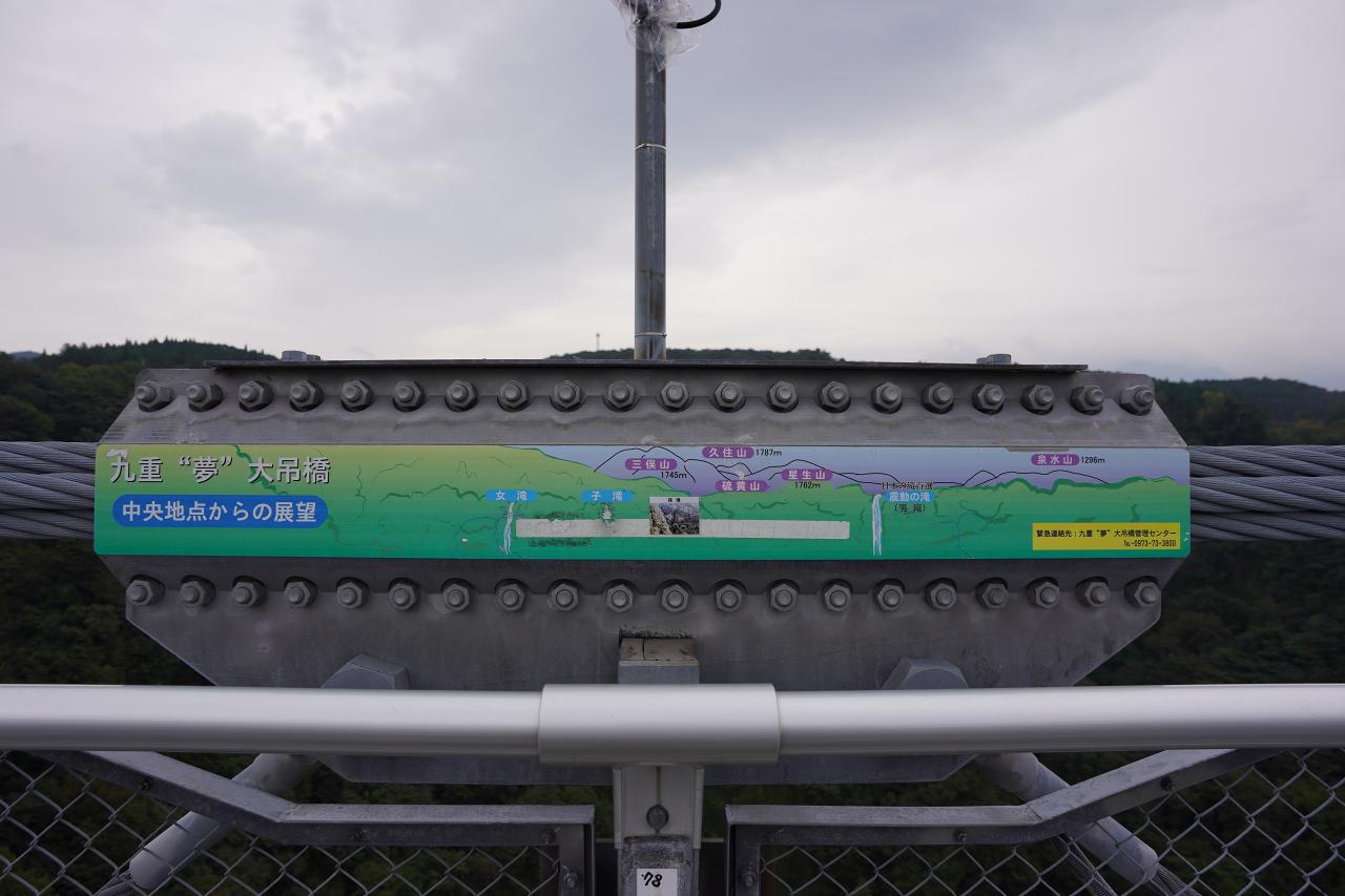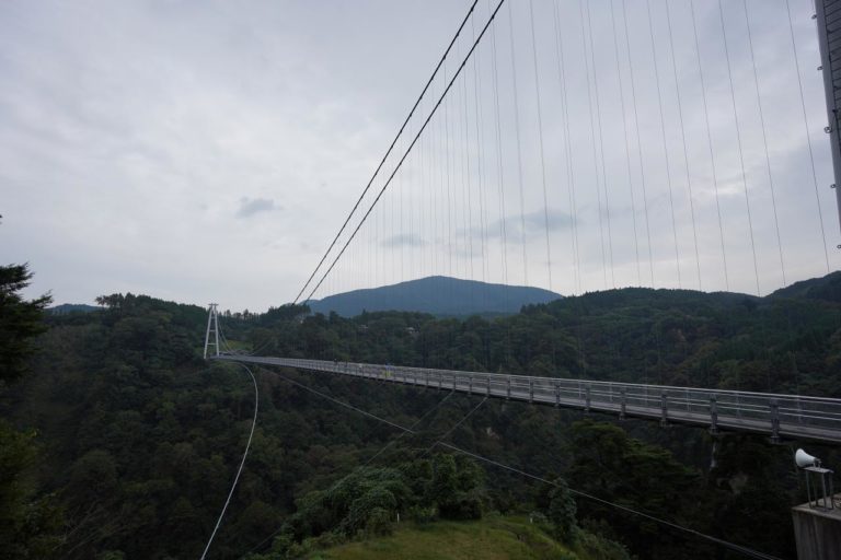 この辺りをGoogleマップで見ていた時から名前を見ていた「九重“夢”大吊橋」が経路上にあるっぽいので、どんな感じなのかな~って見に行ってみました。入口でスタッフがいて「渡りますか~?」と聞かれたので見に来たというと通してくれた。知らなかったんだけど最終入場10分前だったみたい。
