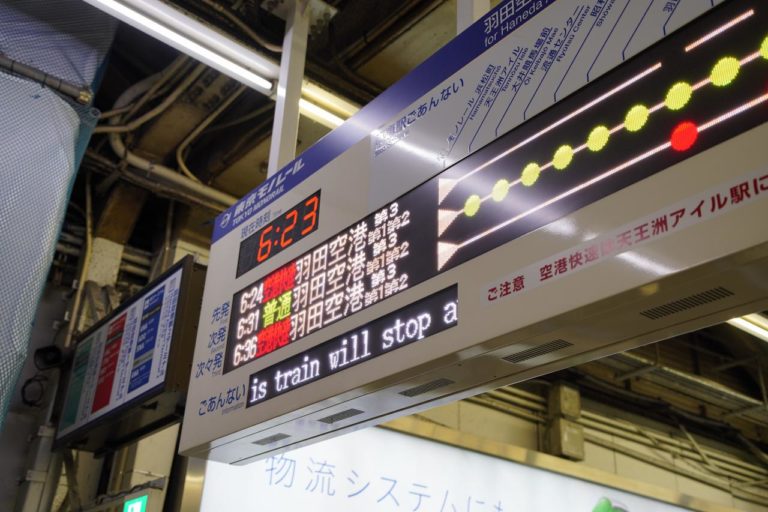 京浜東北線の到着時刻は6時22分、そうして東京モノレールは6時24分発なのでギリギリのタイムアタックに。京浜東北線からの階段で早く行かないと先に進めなくなってしまうので、階段近くのドアで待ってからのダッシュ。何とか間に合いました。