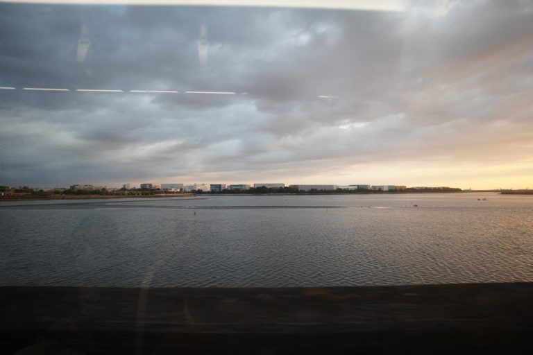 東京モノレールからの景色。パノラマライン(?)とかいう愛称を付けようとしていることもあり、臨海部の景色が眺められるのが魅力。朝だと日の出を楽しむことができます。