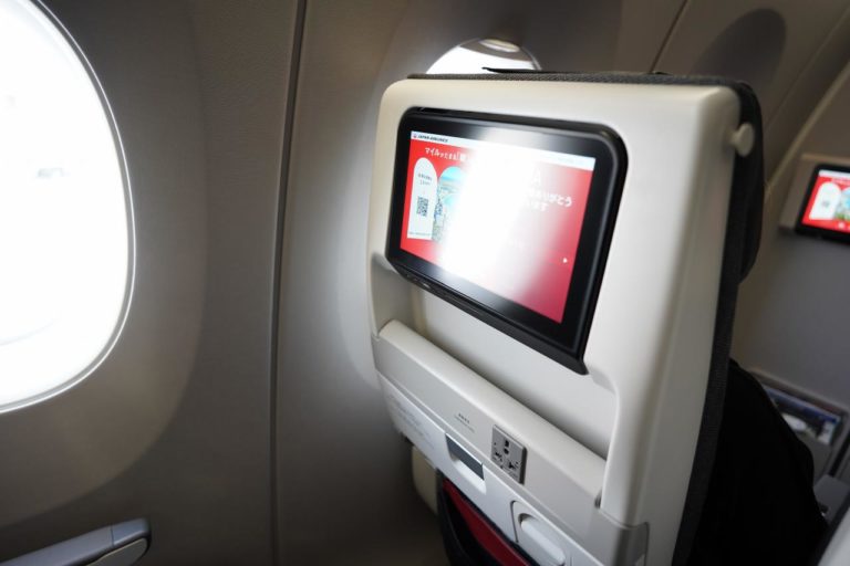 座席の設備。1人に1つモニターが付いているほか、モニターの下にはコンセントが備え付けられています。機内でのモバイルバッテリー使用による事故も多くなっているので、今後はどんどん設置が進みそうです。