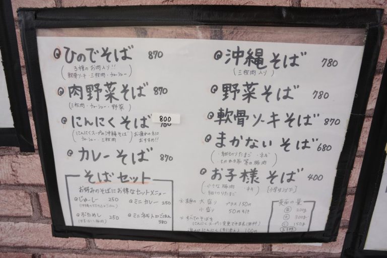 メニューは沖縄そばのトッピング別にいろいろあったけど、おすすめと書かれていた「ひのでそば(870円)」と「じゅーしー(250円)」を注文。合わせて1,120円でした。