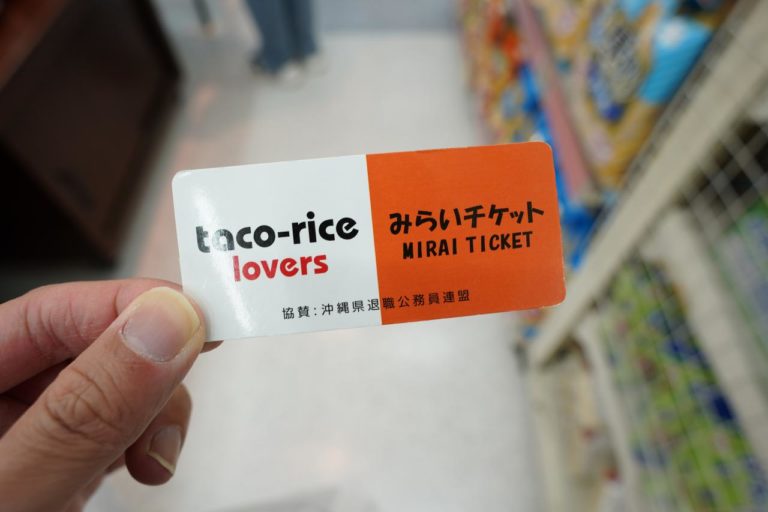 与那国島では買い出しとかする場所があるのかよくわからないので、夜に飲むようなドリンクなどを調達。そしてもう一つ、「みらいチケット」というものを購入。これは大人が328円のみらいチケットを買うことで、小学生以下の子どもが1つタコライスが食べられるというもの。