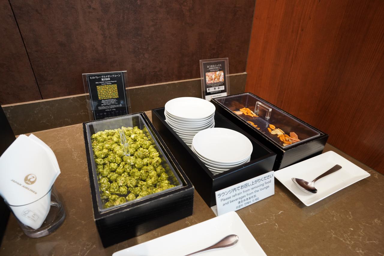 サクララウンジの中でおやつを……と思っていると、いつものおかきの他にポップコーンを発見。ダイヤモンド・プレミアラウンジではいつも置いてあるみたいだけど、サクララウンジで出会えたのは初めて。しかも結構高級そうな雰囲気です。