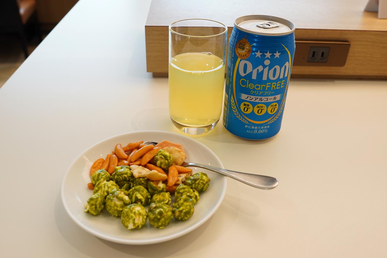 いつものおかきにポップコーン、シークワーサージュースとノンアルコールのオリオンビール。沖縄らしいドリンクを楽しめました。ポップコーンはやさしい甘さで高級感。おいしいね。