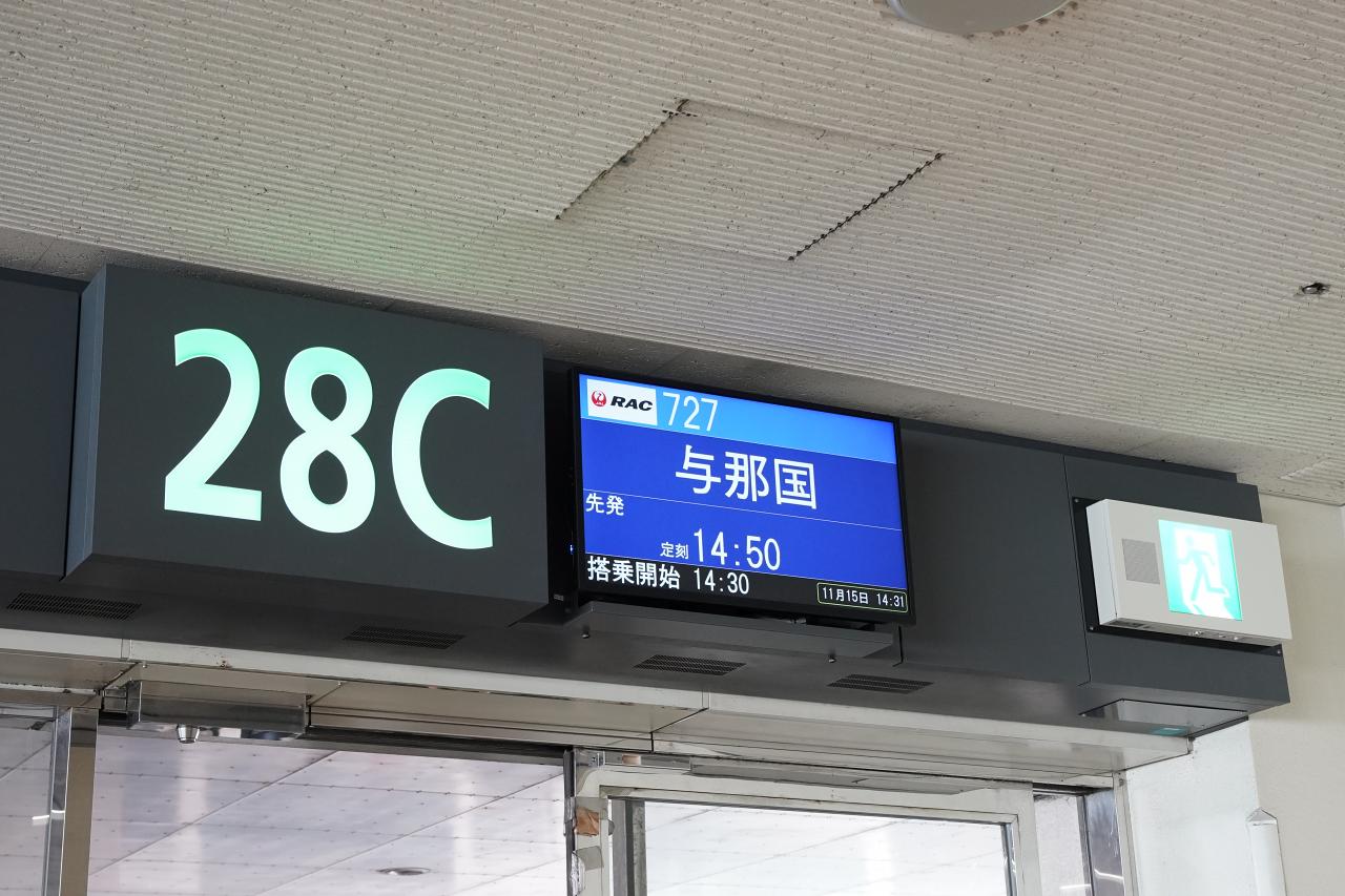 搭乗時間が近づいてきたので搭乗口へ。離島便だからか階段を降りた先にあるエリアからの出発です。運行しているのは琉球エアーコミューターで、JALグループの航空会社。でもワンワールドには加盟していないので、ワンワールドのステイタスでは優先搭乗できません。