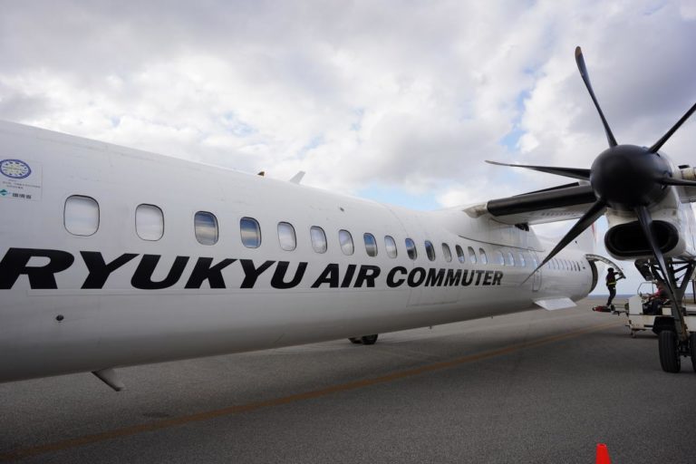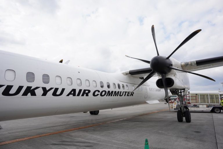 与那国行きの飛行機は「DHC8-Q400CC」というプロペラ機。近くまでバスで移動して搭乗します。搭乗タロップの目の前に止まるので、前面から撮れないのが残念だけど。