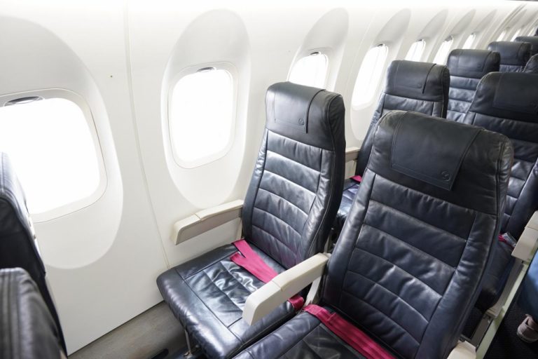 機内はJALらしい本革シート。こういう長く使うものだと合皮よりも本革のほうが長持ちして良さそう。私も本革のリュックとかほしかったりする。
