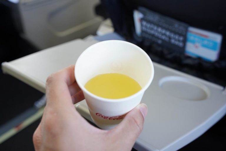 しばらくするとドリンクサービスとしてシークワーサージュースが配られました。バヤリースのやつなのでおいしさは保証済み。おかわりもしちゃった。