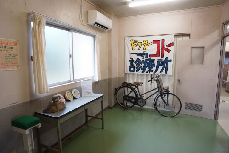 まずは診察室。ドクターコトー診療所と書かれた旗のほか、自転車や机などが展示されています。