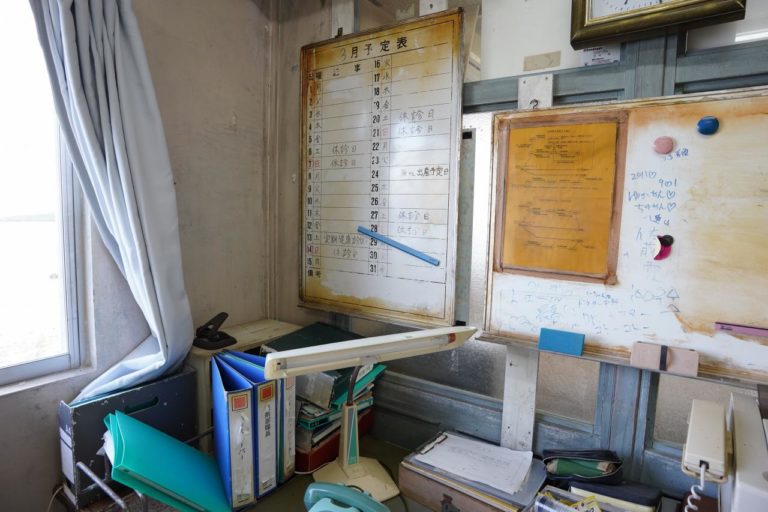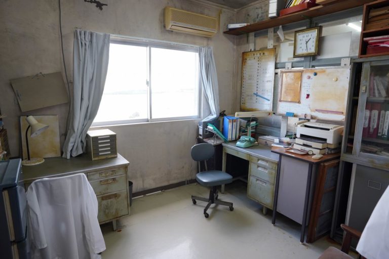 続いて事務室。棚には病院に置いてありそうな資料のほか、白衣も置いてありました。白衣は着て撮影ができるらしいけど、撮ってくれる人も居ないので……。