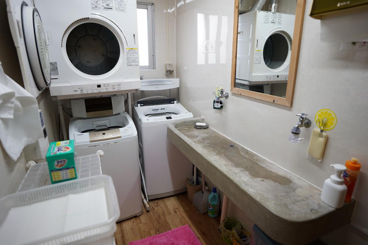 ランドリーや洗面台。なお歯ブラシやカミソリといったアメニティは無いので、必要な人は自分で持ってきましょう。与那国島には夜までやってるコンビニのようなお店は無いので、夜にないと思っても買いに行けません。
