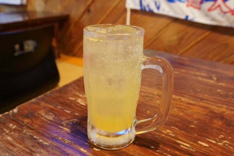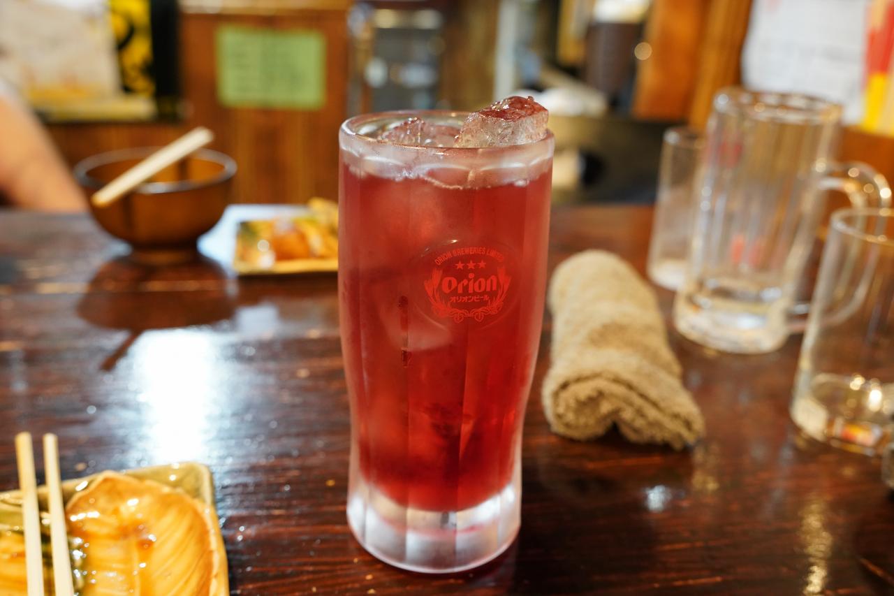 夕陽を見たら民宿の下にある「居酒屋まるてぃ」で夕食です。まずはシークワーサーの果実酒をソーダ割りした一杯。あんまりお酒強くないから薄目に作ってもらったけど、これでも結構来る……。