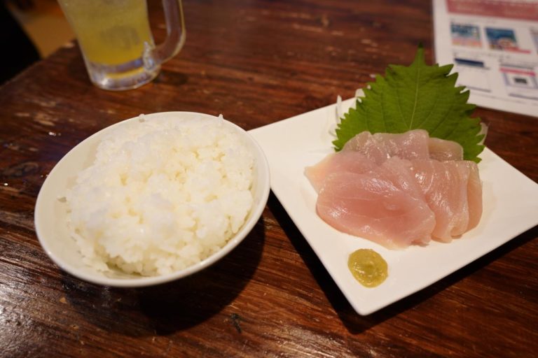 続いては与那国島が日本で一番の漁獲高だという「カジキ」の刺身(880円)とライス(150円)です。お酒のおつまみだと刺身だけで良い気もするけど、私はやっぱりごはんと一緒に食べたい。