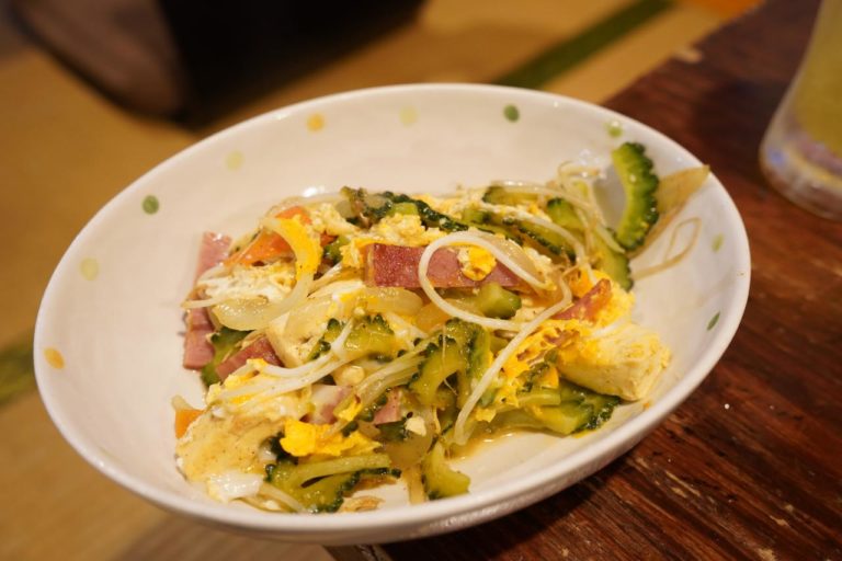続いては沖縄料理の定番、ゴーヤチャンプルーです。あんまり苦みが強くないゴーヤに野菜、島豆腐にスパム(かな)などがたっぷり入ったボリュームメニュー。野菜もたくさん取れて栄養バランスが良さそうだよね。