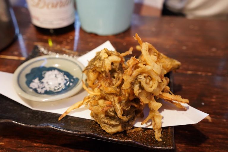 続いてはもずくの天ぷら。沖縄らしいふわふわとした衣の天ぷらを塩でいただきます。