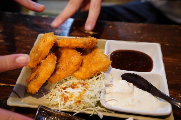 ソースとタルタルで食べるカジキのフライ。たんぱくな味わいのカジキなので、フライにしても脂がしつこいこともなく案外さっぱり食べられます。ちなみに見えている指は合流した人たちの。