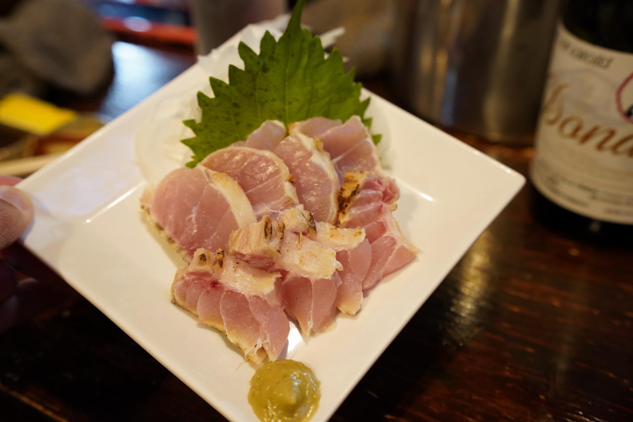カジキのお腹の部分のお刺身です。先ほどの普通の物に比べて脂がのっているのでそのまま食べても上質な脂を感じられる部位です。これ合い盛りとかあれば1人でも頼みやすいなとふと思った。