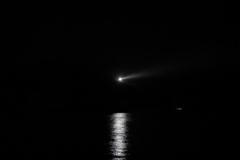 食後に少しお散歩も兼ねて、4人で海の方へとトコトコ。真っ暗で何があるのかよくわからなかったけど、灯台の光が照らす海岸っぽいところへとやってきました。