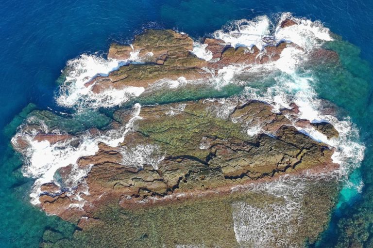 ドローンを飛ばして撮影すると岩場の様子がはっきりと見ることができます。おそらく下までいければ浅瀬なので行けるとは思うんだけど、下に行くのが難易度高すぎる。石垣島くらいに観光客がくればツアーとかも組まれそうだけどなぁ。
