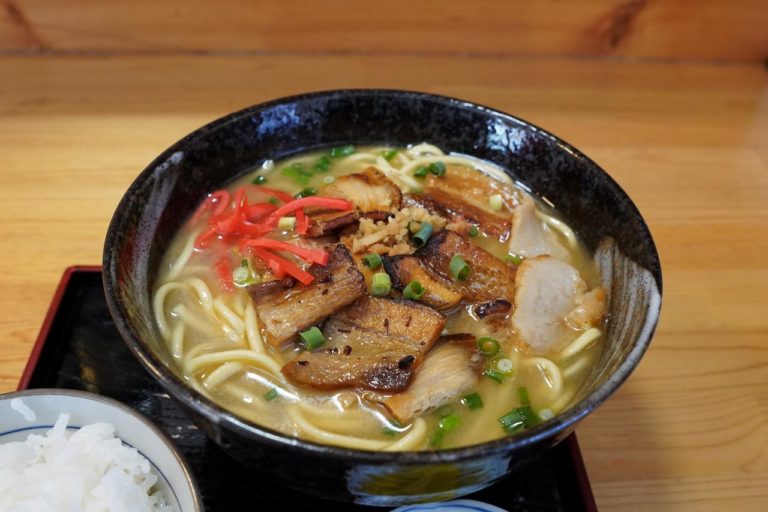 少し待つと頼んだ八重山そばが到着。八重山そばは丸い麺に薄切りのお肉がのっているのが特徴で、雰囲気的にはタンメンみたいな感じ。コーレーグースとか山椒を掛けていただきます。