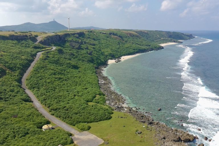 あれは「トゥイシ」と呼ばれる場所で、西崎から見ると断崖絶壁の下。高台から見るとこんな感じに見えるけど、ちょっと物足りないのでドローン飛ばしてみました。