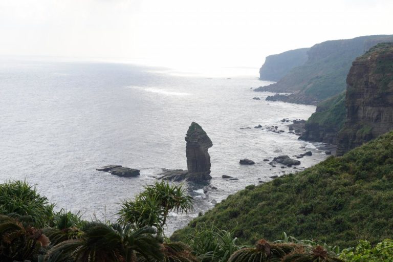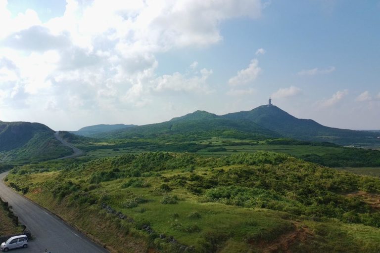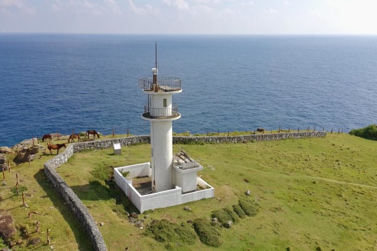 立神岩の辺りでドローンを地上高く上げて撮影。こうして見ると自然たっぷりの島だよなぁ。遺構と思えば羽田から日帰りでも行けるので、一度は行ってみてほしい島。沖縄旅行の中1日で行くとかも良いかもしれません。