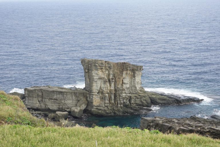 与那国島で最後に見に行ったのは、東崎の手前にある「軍艦岩」です。ここはその名の通り軍艦のような岩がある場所で、見てみると確かにそっくり。でも近くまで行ける道が災害で崩れてしまっているので、遠くの展望台からしか見られないのが残念。
