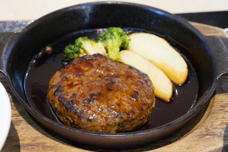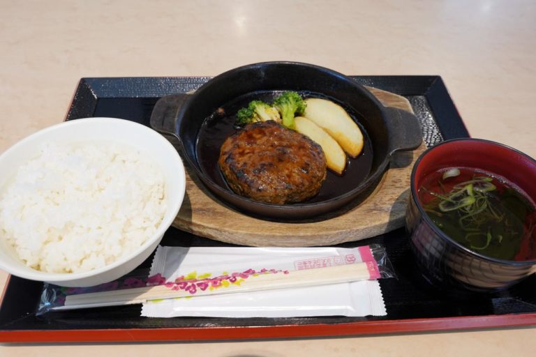 まずはフードコートにあったお肉屋さんで石垣牛を使ったハンバーグ。お値段はなんと1,800円と結構高めです。以前は1,500円だったみたいだけど値上げしたみたい。少し悩んだけど、次に来た時には2,000円になってそうってことで注文。