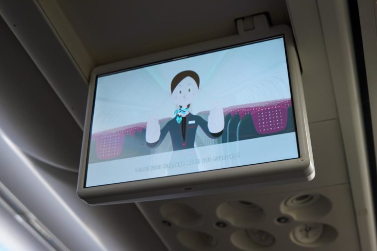 JAL便との違いといえば、機内での安全ビデオ。JALでは実写のお姉さんが登場しますが、JTAでは模したアニメーション作品となっていました。こういう違いを探すのも楽しい。