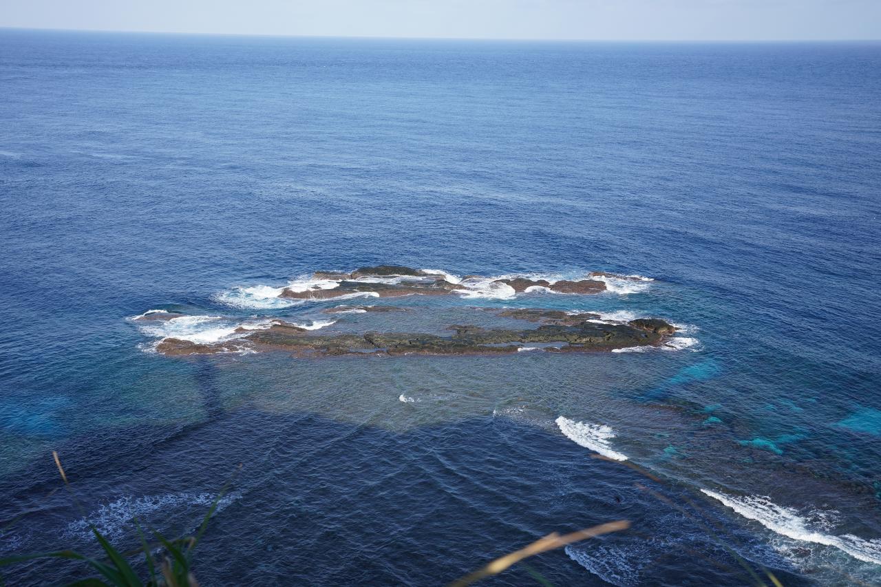 高度を上げてほぼ真上から撮影。トゥイシの先から水深が深くなっているので、与那国島の陸地の先端がここってことになるのでしょうね。