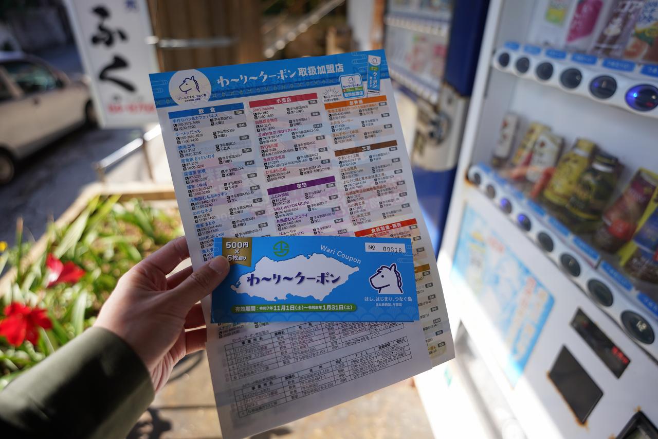 昨日の夕飯の時に知ったんだけど、与那国島では期間限定で「わ〜り〜クーポン」という町外から来た人向けのクーポンを配布中。1,000円あたり500円のクーポンを1枚使えるという内容で、実質半額になるって感じです。