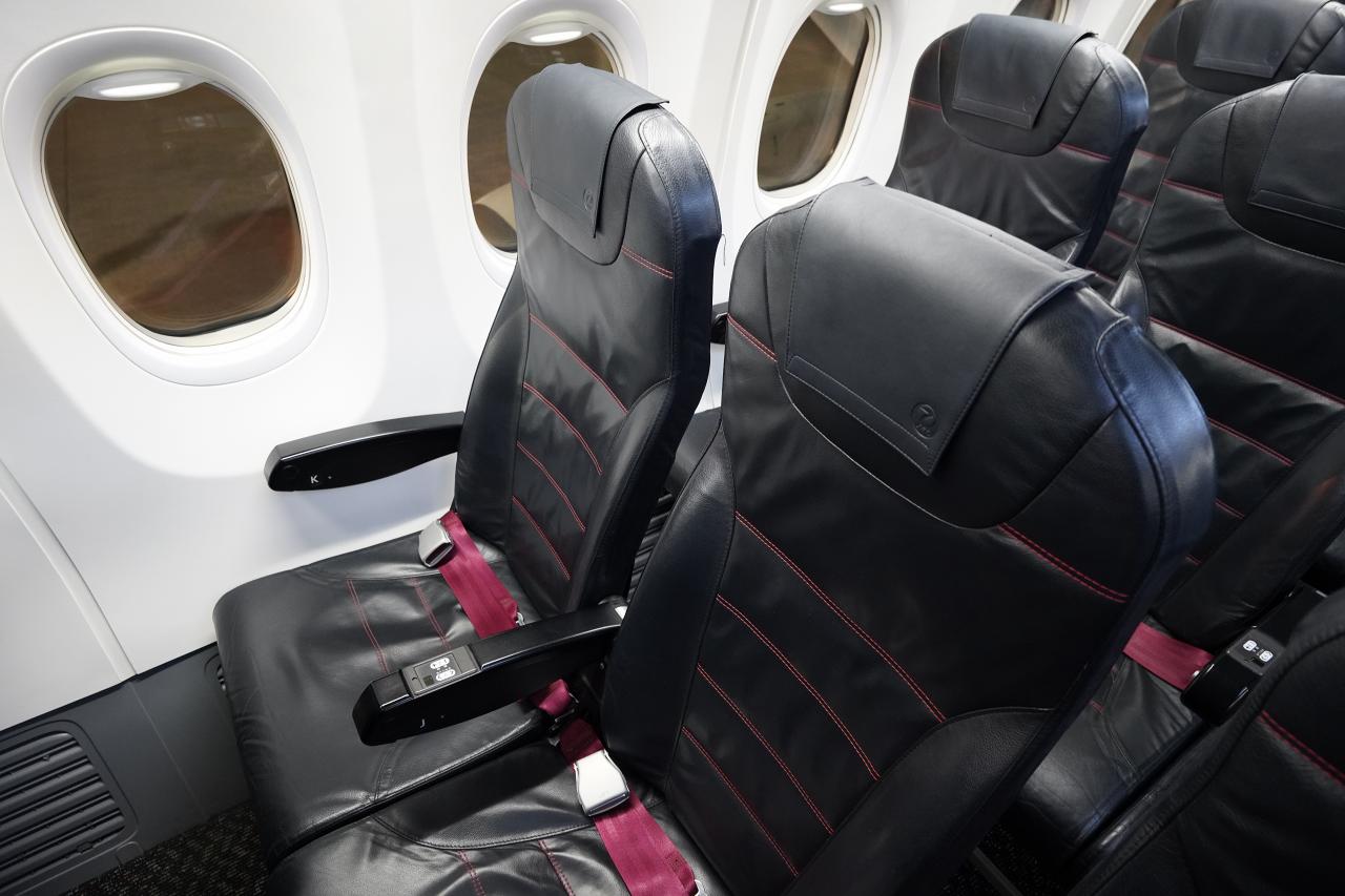 早めに搭乗して荷物を整理しつつ座席へ。機内の様子もJAL便と大差なく、座席のクオリティーも同じ。機体は73H、ボーイング737-800の中型機体です。座席にはUSBの充電プラグがあるので、パソコンの充電はできなくてもモバイルバッテリー経由で何とかなるかも。
