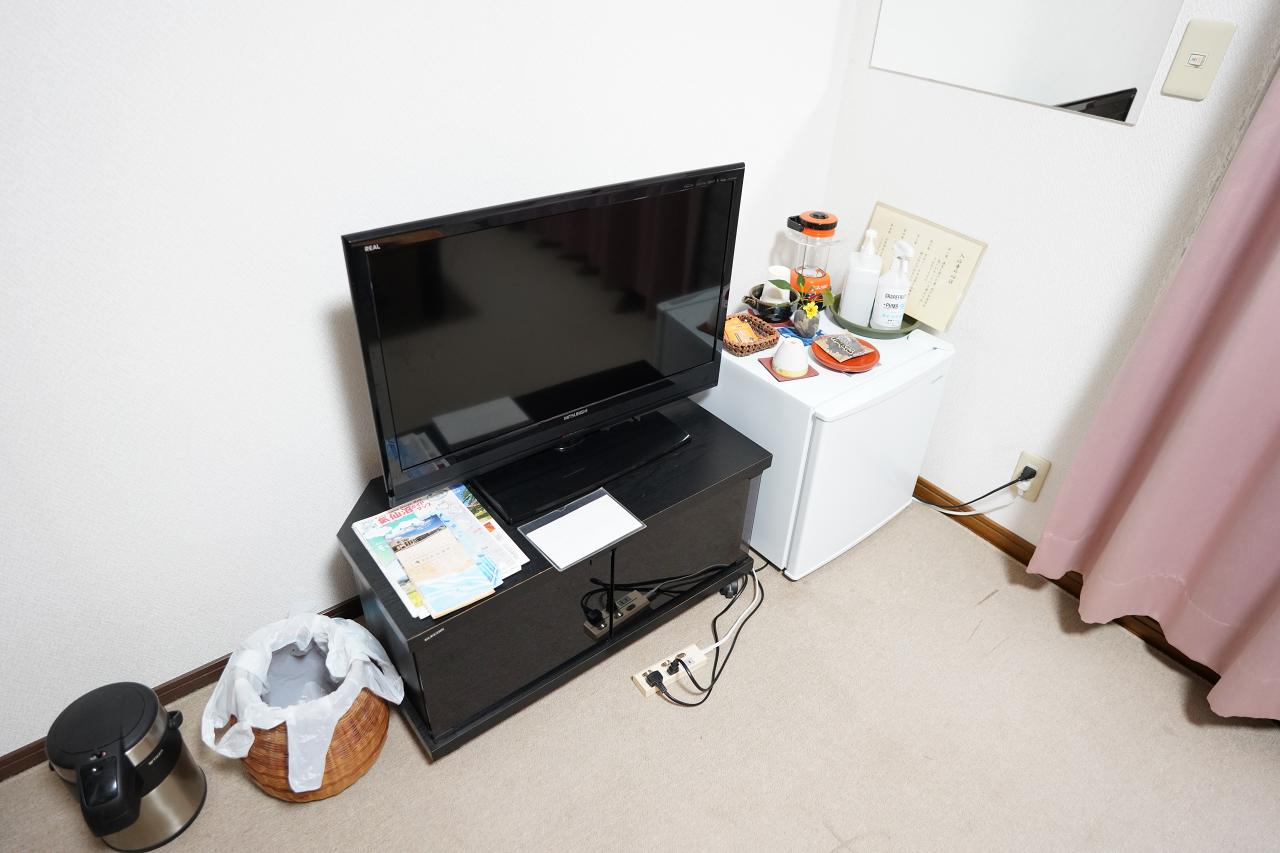 部屋にはテレビと冷蔵庫、ティーバッグとお茶請けが置いてありました。こういう民宿だと冷蔵庫は共用ってところが多いけど、各部屋に1台ずつ置いてあるのは嬉しい。また、テレビは通常の地上波を見られるほか、DVDで東日本大震災の津波映像を見ることが出来ます。
