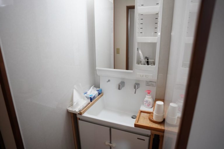 洗面台やトイレは共用設備として準備されています。新しく設置したようでめちゃくちゃきれい。歯ブラシやカミソリはアメニティとして備え付けられていました。