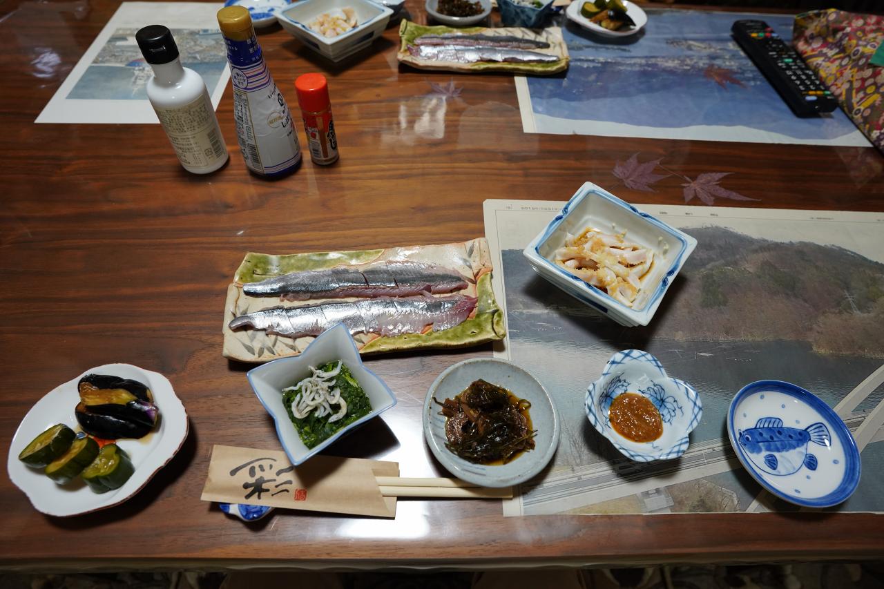 夕食は1階の部屋でいただきます。まず最初に並んでいたのはサンマの刺身とマンボウのこわた(腸)にモロヘイヤなど。サンマも丸々1匹分でたっぷり。