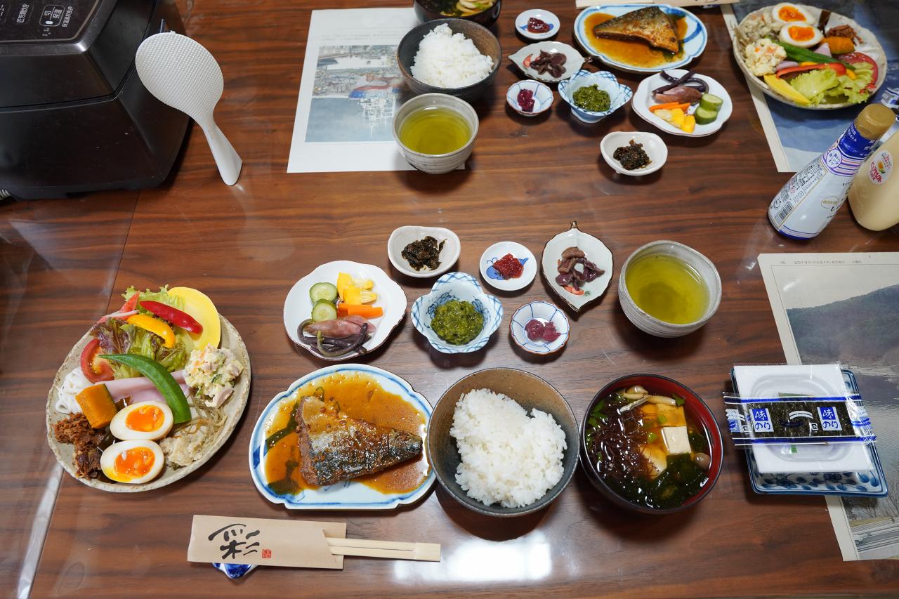 サバの味噌煮や野菜プレートなど、ボリューム満点の朝食