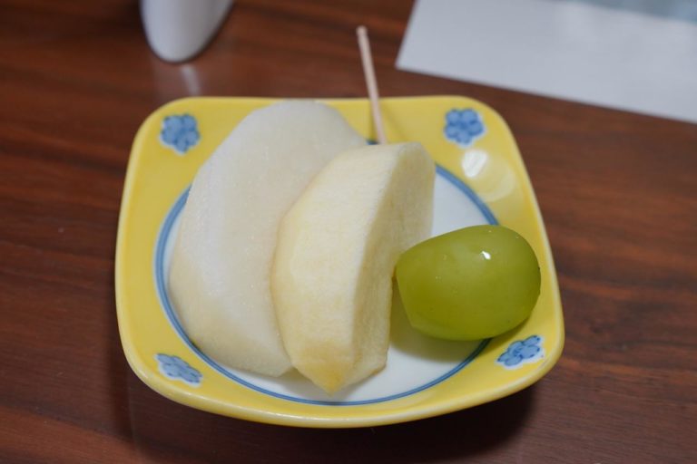食後のデザート。ナシとリンゴ、さらにシャインマスカットでした。結構お腹くるしい感じになっちゃったけど大満足。ごちそうさまでした!