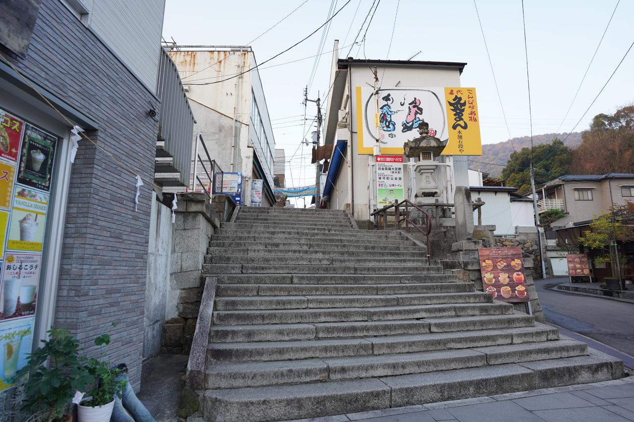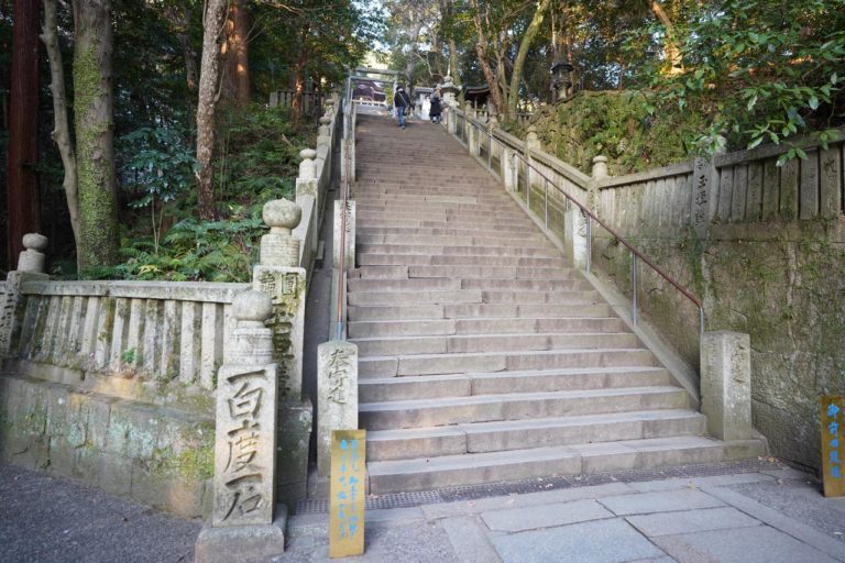 そうして最後にそびえ立つ長い階段。133段の急な階段となっていて、ここを上りきらないと本殿にはたどり着けません。なんだか乗り越えないとゴールにはたどり着けないってのを体現してる感じだよね。