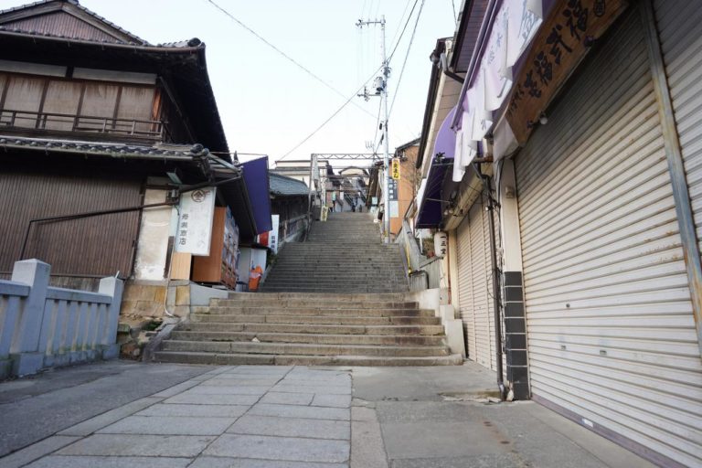 昼間はお土産屋さんが立ち並ぶ参道も、今の時間はまだ開店前。シャッターに挟まれた道をトコトコ歩いて進みます。左側に見える「小松屋」は楽天市場とかでよく見かけるお店。ポイント消化とかで買ったりするよね。