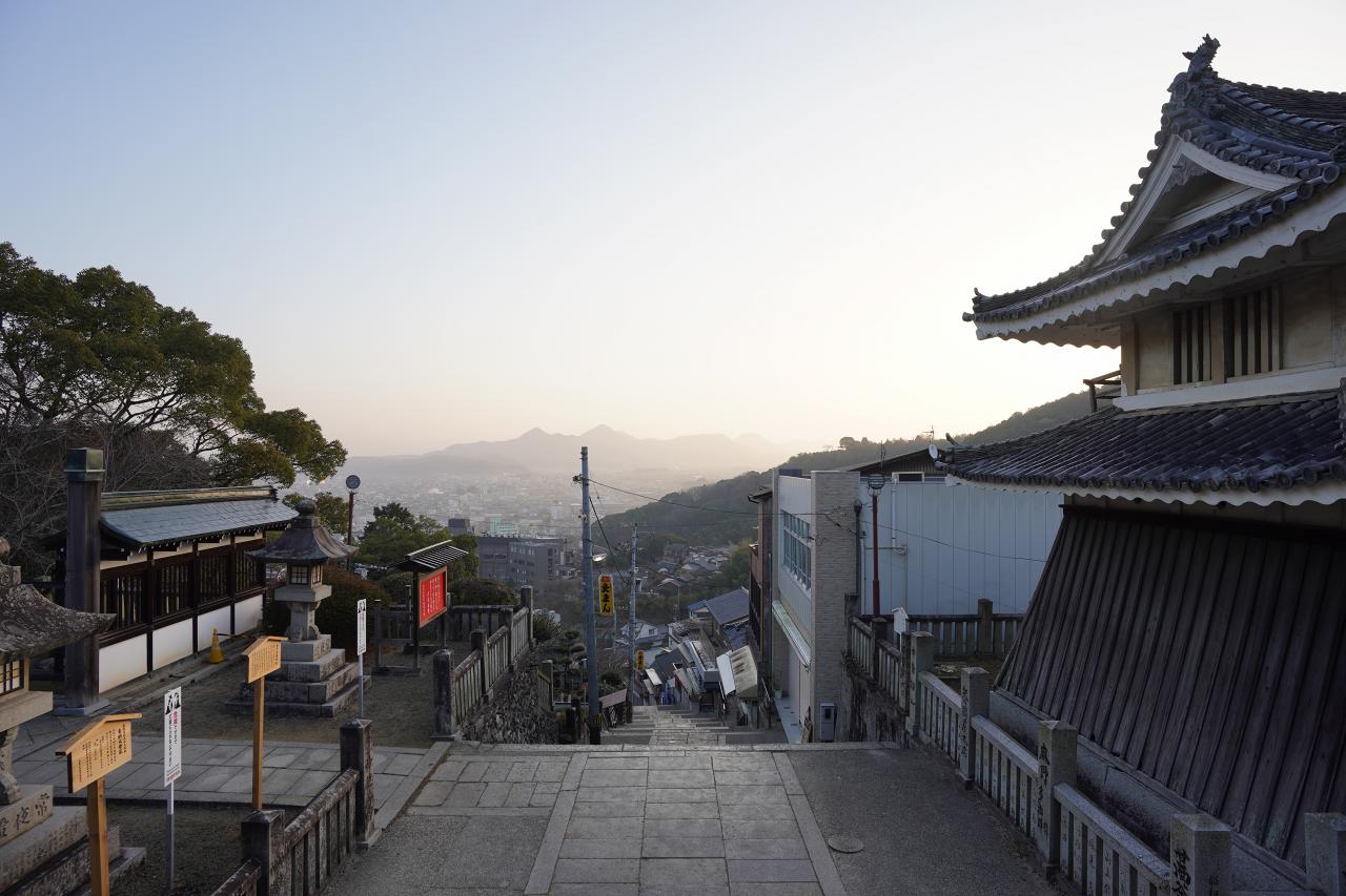 そしてこの大門まで来たら後を振り返ると、ここまで上ってきた参道と琴平の街をを一望できます。昼間だと人が多くて撮影しにくいんだけど、この時間なら気楽に撮影可能。