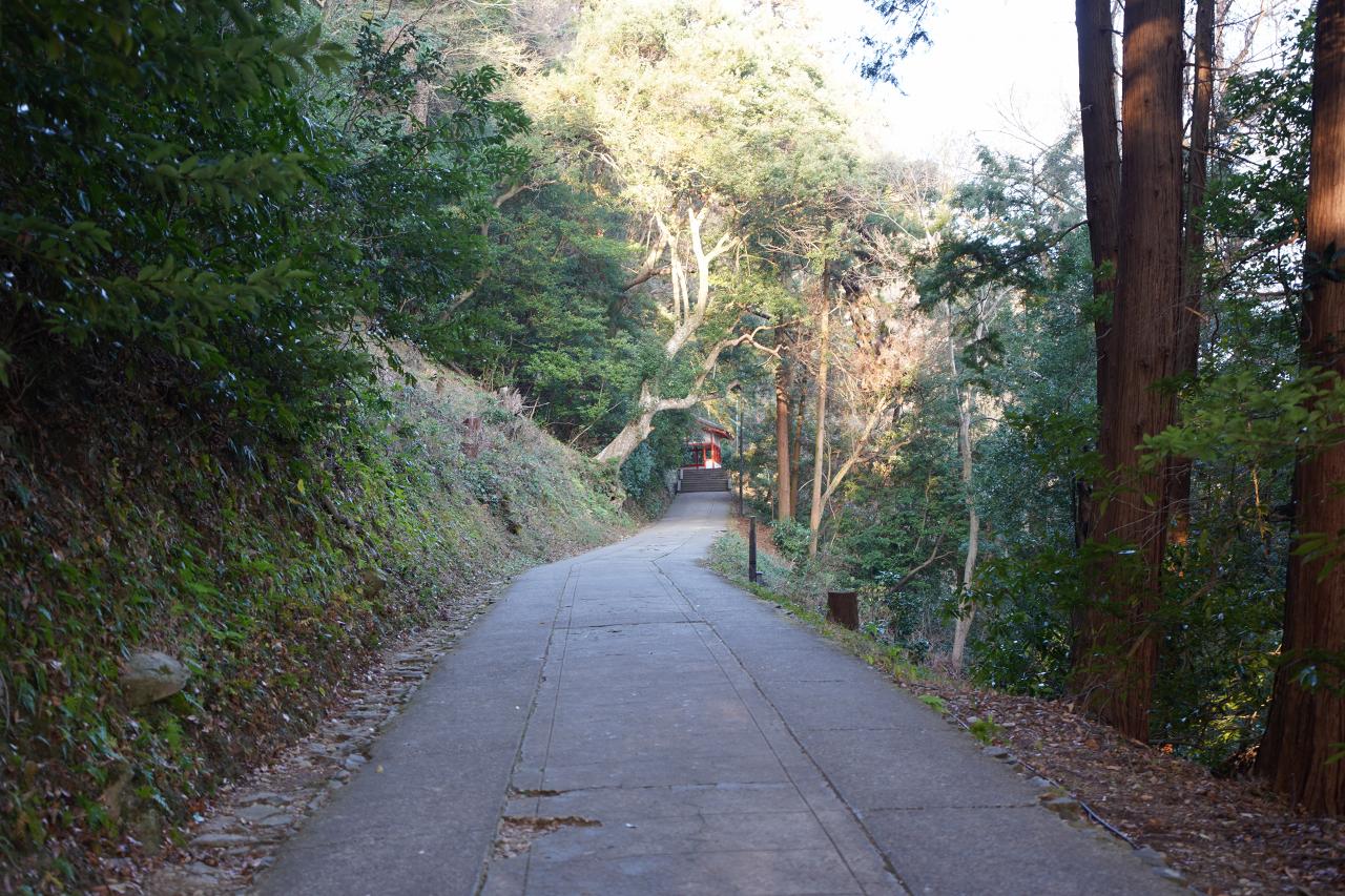 大門をくぐって参道を進みます。ここから突き当たりまでは平坦な道が進むので、ここまでの階段で少し疲れた体を休ませながら進んでいきます。それにしても上から早歩きで降りてくる人がいるけど、近くに住んでいる人とかなのかな。