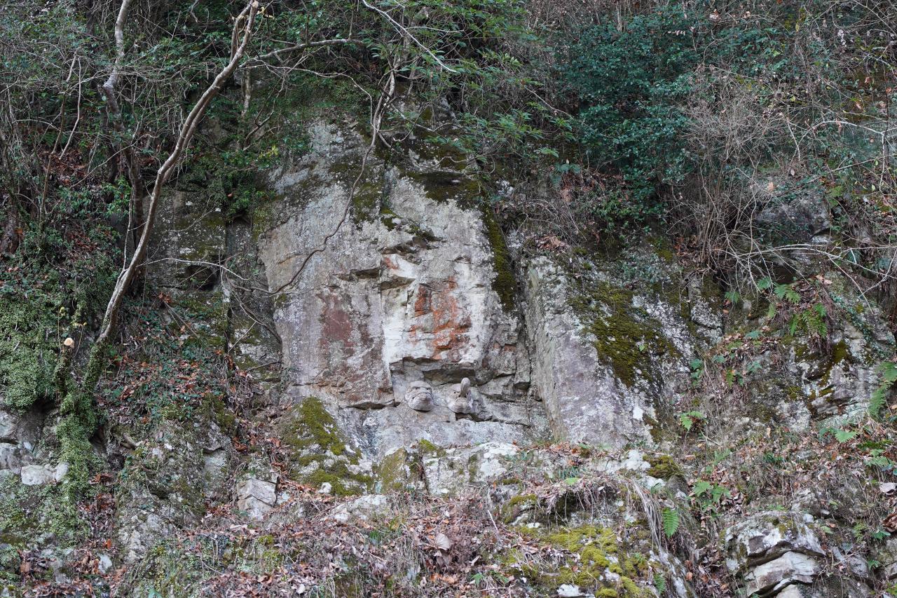 横の断崖には天狗とカラス天狗の彫り物が付けられています。上の方を眺めすぎちゃうけど、中央よりも下あたりにある。