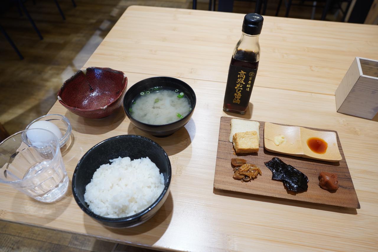 入店すると、昨晩頼んでいたので和食が運ばれてきました。内容はご飯に卵、味噌汁におかずが数品。香川に居るとうどんばかりなので、こういう朝食もいいよね。