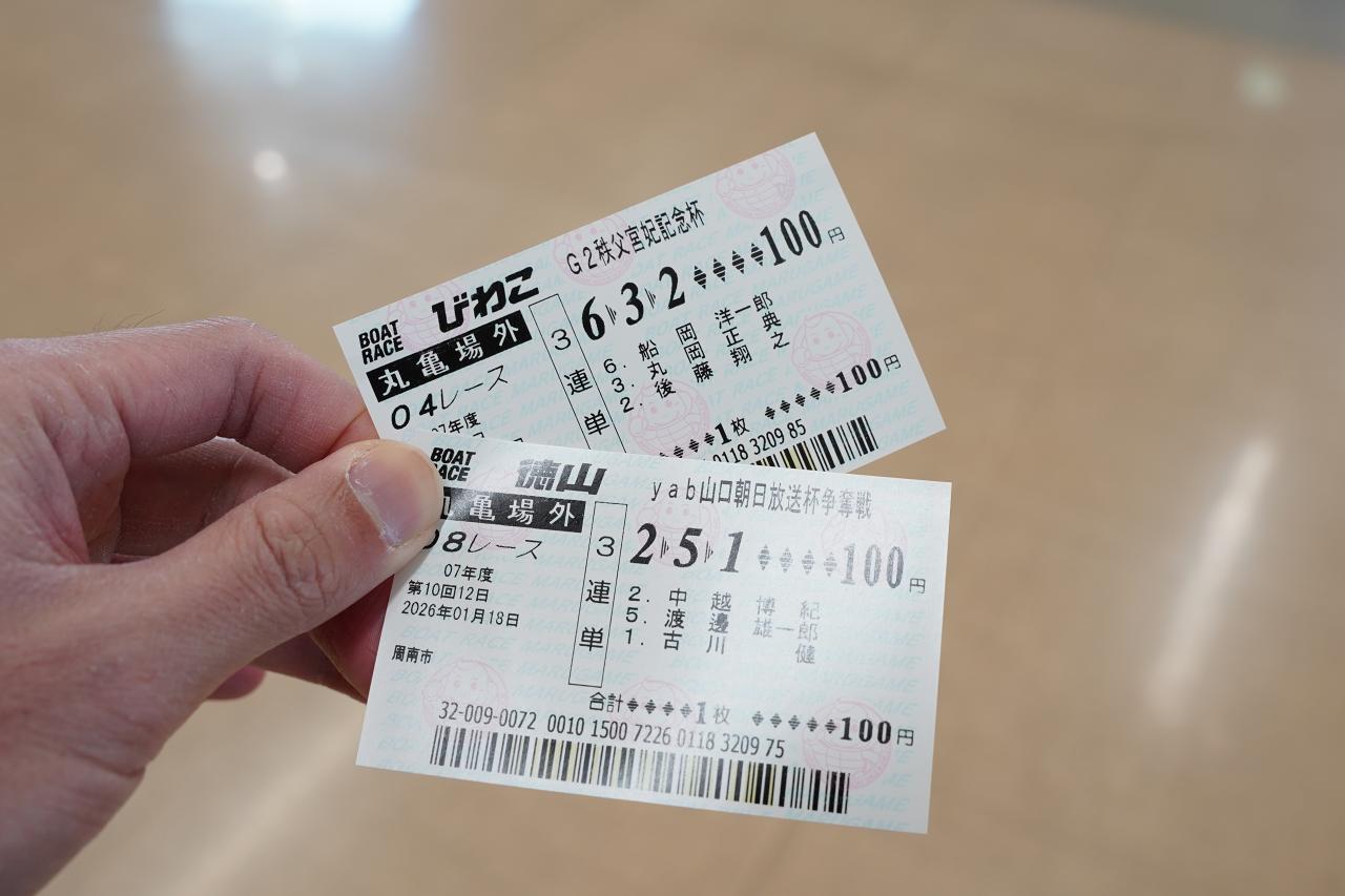 さて、今日は場内ではやってないみたいなので場外の舟券を購入。徳山は少し外して、びわこは大穴狙いです。