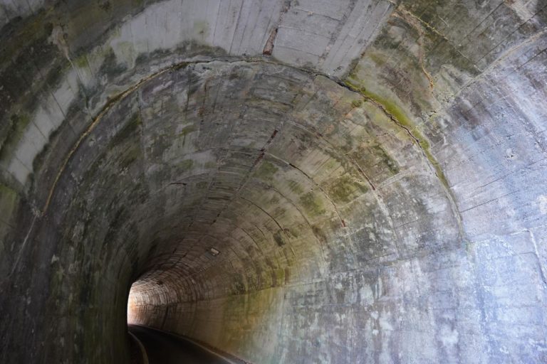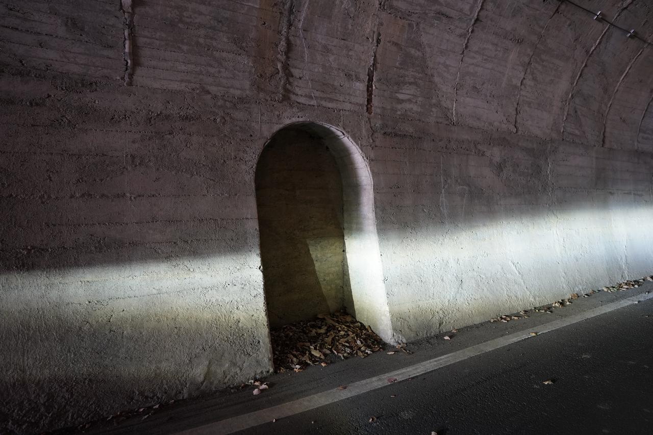 トンネル内には待避口が用意されていて、ここが鉄道トンネルとして建設されたことを示しています。トンネル内は結構暗いので、散策するならライトがあると安心(写真は車のライトを使ってる)。